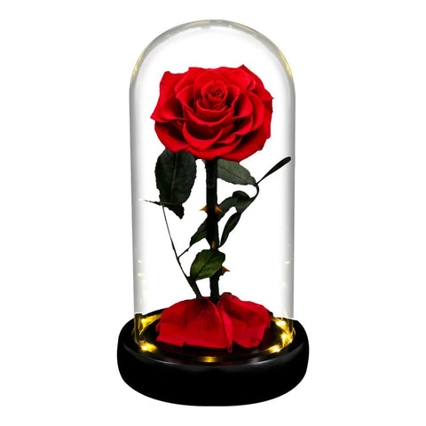 💎 Un Écrin de Transparence La rose repose sur un socle en bois noble et est abritée par un dôme en verre borosilicate haute clarté. Ce verre, plus pur et plus résistant que le verre standard, protège votre fleur de la poussière tout en magnifiant chaque pétale sous tous les angles.